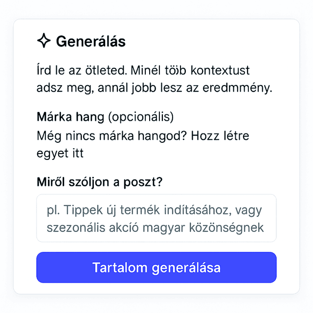 Adj meg néhány kulcsszót, és az AI a márkád hangján megírja a posztokat. Nincs több üres képernyő előtti szenvedés.
